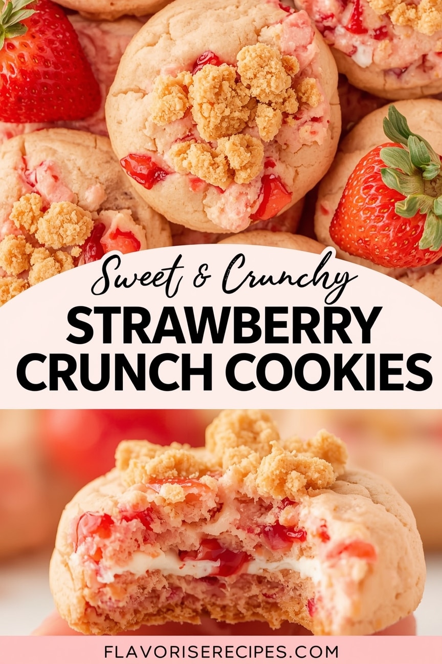 These Strawberry Crunch Cookies are more than just a dessert; they’re a delightful journey back to simpler times, elevated with sophisticated flavors and textures. The harmony of the tender, fruit-infused cookie and the irresistible, buttery crunch makes them an instant classic. Whether sharing with loved ones or savoring one yourself, these cookies are sure to bring smiles and warm memories. Dive in and experience the magic of homemade happiness!